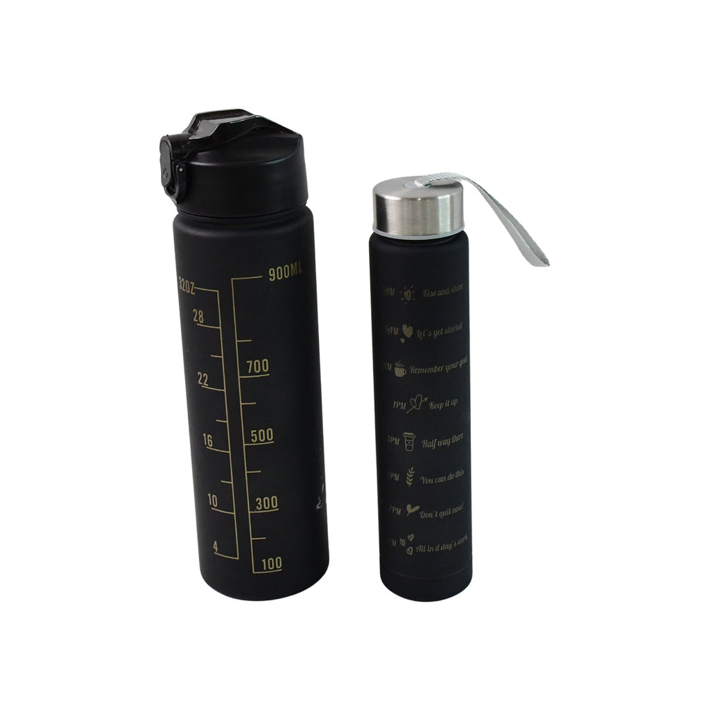 2 Pc Premium Black Motivational Water Bottle Set (900 ML + 300 ML) – Leakproof Sports & Office Sipper Bottles with Measurement Scale and Carry Strap