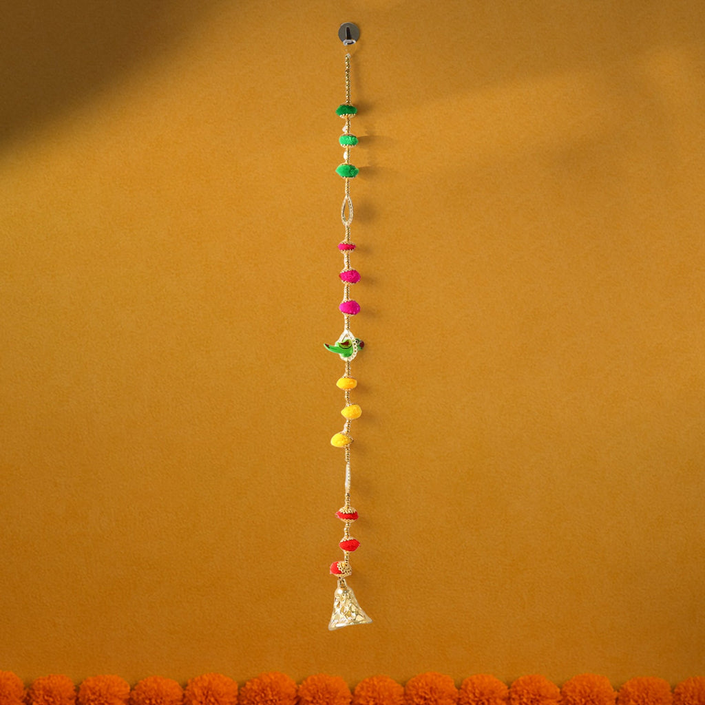 This vibrant and traditional decorative hanging is designed to add auspiciousness and festive charm to your home or workspace. Crafted with colorful pompoms, golden beads, mirror embellishments, and a unique parrot motif, it also features a golden bell at the bottom, symbolizing positivity and prosperity. Perfect for hanging on doors, walls, pooja rooms, and temples, it enhances the spiritual ambiance of any space. Its bright design and cultural symbolism make it an ideal décor piece for festivals, housewarming ceremonies, and special occasions, while also serving as a thoughtful gift.